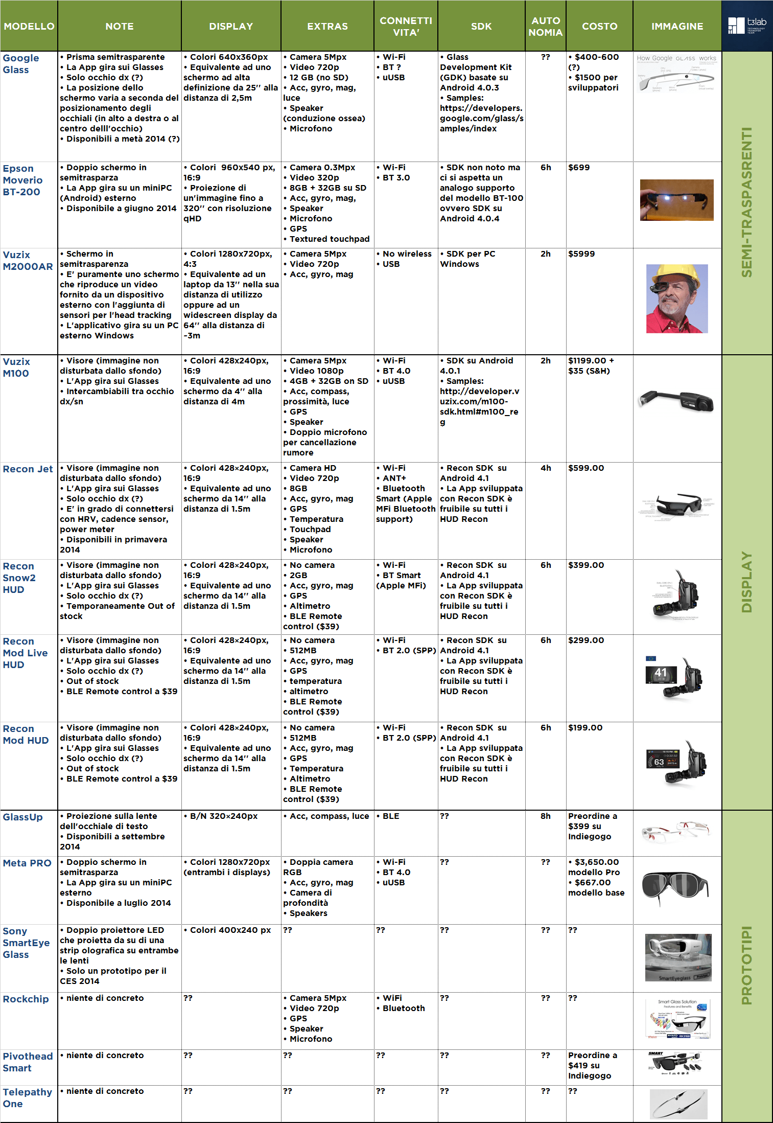 Abbiamo realizzato la tabella, visibile qui di seguito, per elencare i principali Smart Glasses con cui è possibile sviluppare soluzioni custom, disponibili ora o nei prossimi mesi. I prodotti sono suddivisi in due categorie principali: quelli che proiettano il contenuto visivo su di un supporto semi-trasparente, in sovrapposizione a quanto si sta guardando, e quelle che integrano un vero e proprio display. Inoltre, è presente una categoria denominata prototipi che tiene traccia delle idee che sono state presentate ma per le quali non è ancora disponibile un acquisto diretto del prodotto. Non abbiamo riportato soluzioni che prevedono l’occultamento del visibile, come ad esempio i visori recentemente acquistati da Facebook, Oculus Rift.